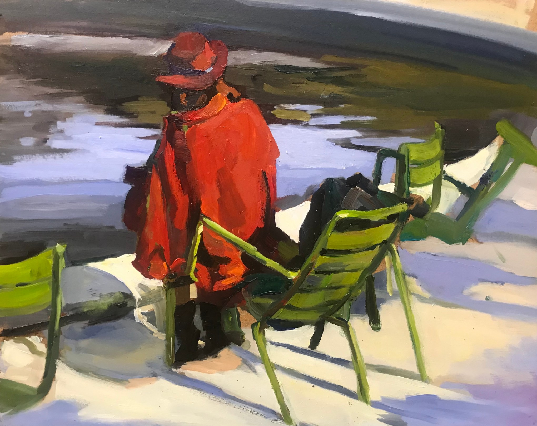 Dans le calme du Jardin des Tuileries, une silhouette vêtue de rouge se détache face au bassin. L’éclat de sa présence dialogue avec le vert des chaises emblématiques de Paris, dans une harmonie de lumière et de couleurs.