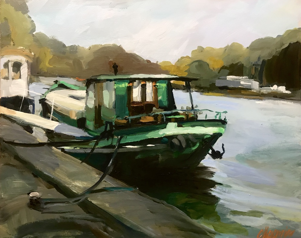 Amarrée au bord du quai, la péniche se fond dans la douceur des reflets de la Seine. La lumière automnale enveloppe la scène d’une atmosphère paisible et intemporelle, au cœur de Paris.