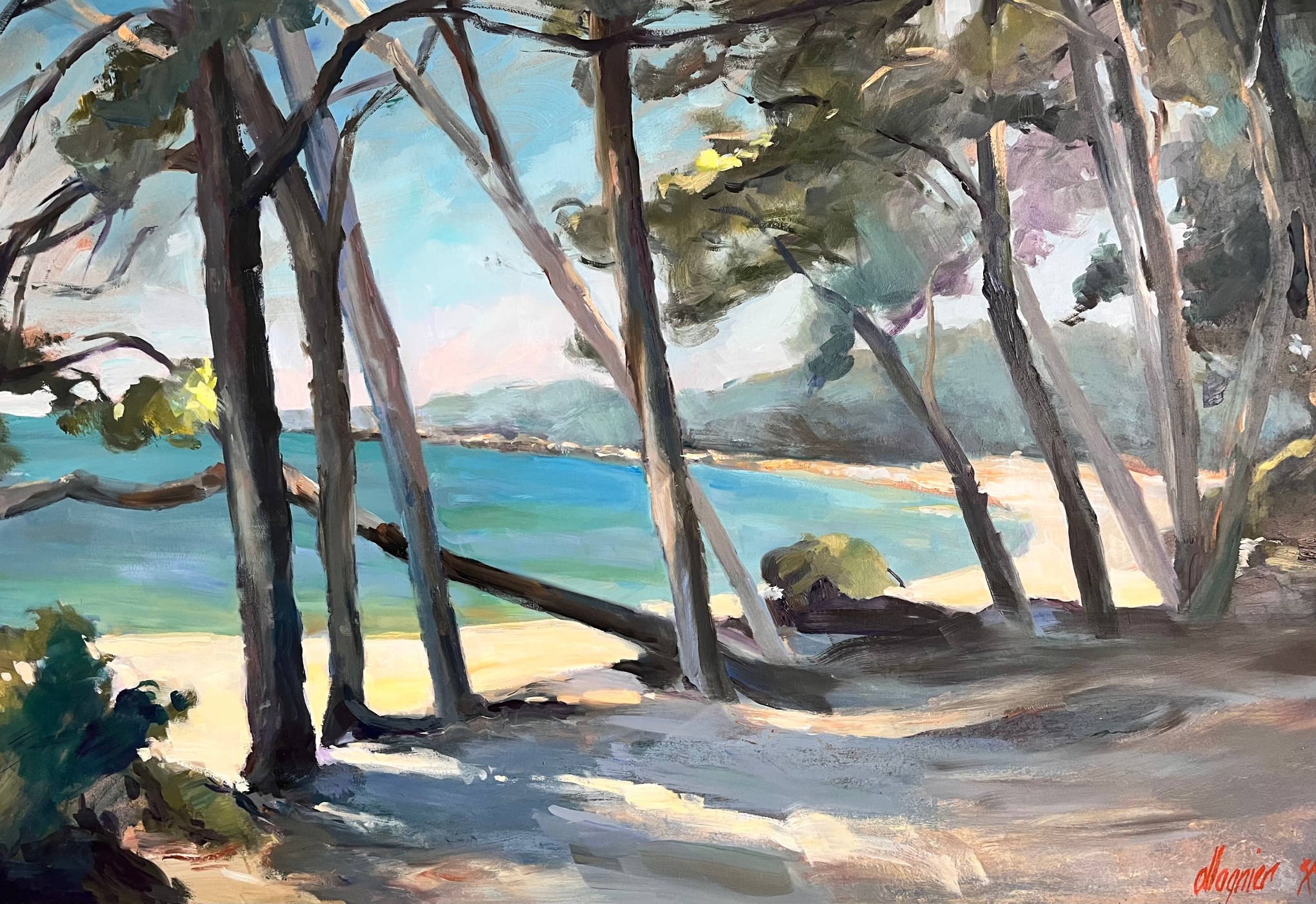 Pins en bord de Méditerranée pinède du Midi, saisie sur le vif, où les bleus et les ombres structurent l’espace.